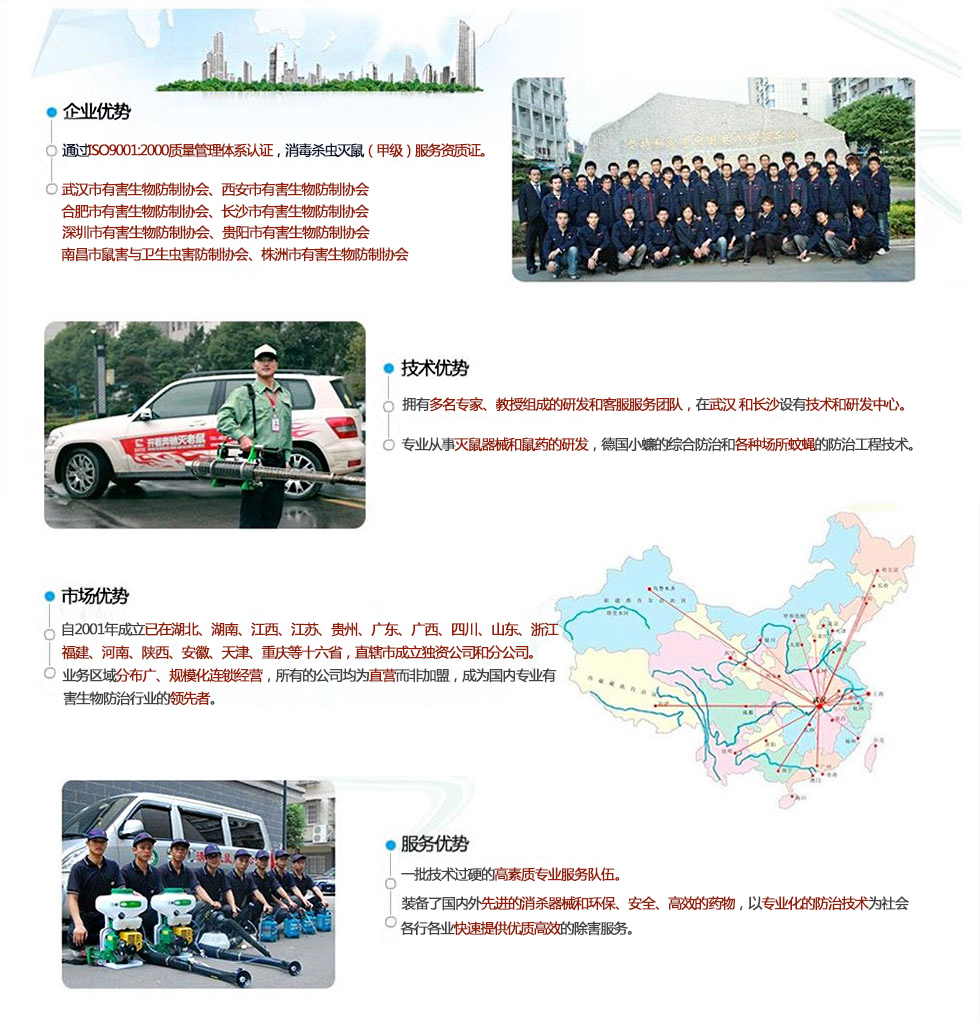 我們堅持“誠信、高效、安全、環(huán)保”的服務宗旨,所用器械均為世界優(yōu)質產品,所用藥物均系國家藥檢部門和衛(wèi)生防疫部門批準的安全、低毒的城市衛(wèi)生用藥,并根據(jù)具體作業(yè)環(huán)境和防治對象情況變化,制定具體防制方案,保證優(yōu)越的防治效果和人體安全。